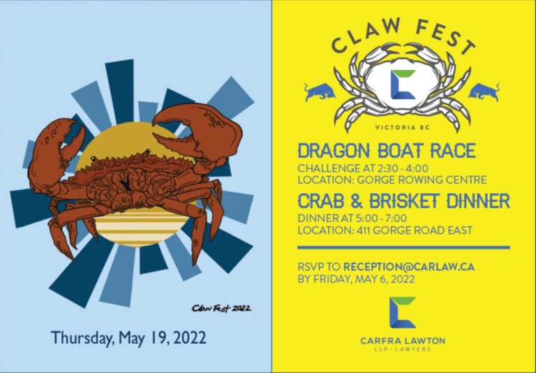 Claw Fest is back! We hope you will be able to book off an afternoon and/or evening for a fun team building dragon boat race and hearty crab fest menu and beef brisket. We hope to see you at both events, but you can elect to just come for the race or dinner. All of the activities are within walking distance of our Victoria office.